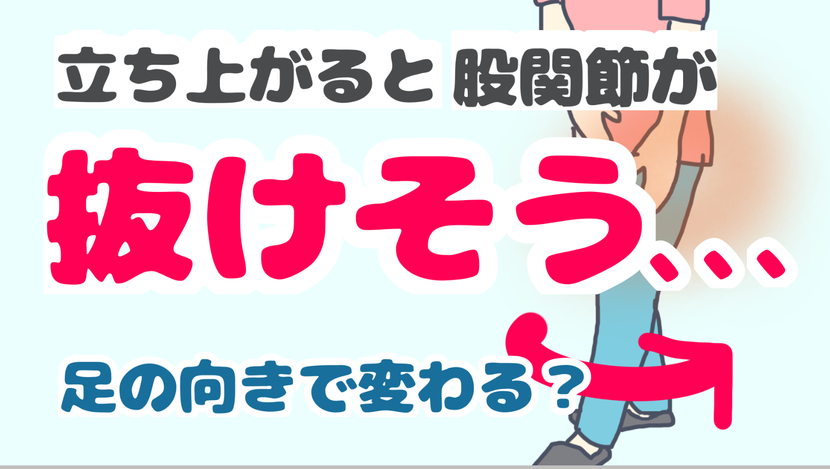 なので、歩き始め、立ち上がりに不安感がある方は、股関節が過度に回旋しないようにした方が楽になることが多いです。