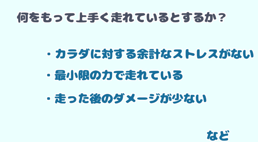 逆に、カラダに余計なストレスがかかって、より多くの力を使って走っている状態がうまく走れていない、ということになります。